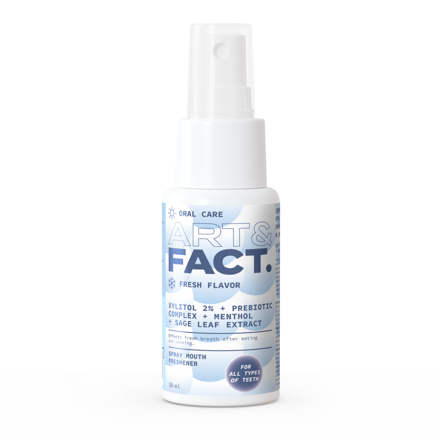 Xylitol 2%+ Prebiotic Complex + Menthol + Sage Leaf Extract. Spray mouth freshener